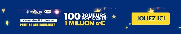 La fdj et les loteries européennes organisatrices de l'euromillions proposent une nouveauté pour le tirage du vendredi 21 janvier 2022, . Il permettra à 100 personnes tirées . 8 2 6 3 0 1 extralux logo 14 15 34 38 40. Rapports des gains pour ce tirage euromillion du 18/01/2022 : . Mar., 25.01.2022 heure de clôture heure 19:30.